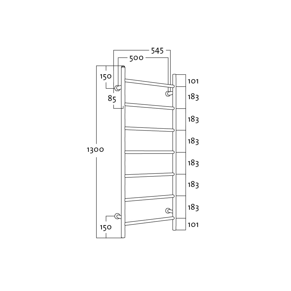 Torken har sju horisontella stag som ger bra med utrymme till dina handdukar. Denna handdukstork är eluppvärmd med kabel (ej vätskefylld), det ger dig möjlighten att placera handdukstorken upp eller ner. Anslutning kan därmed göras i antingen höger nedre/vänster övre ben (standard lagervara) eller vänster nedre/höger övre ben (leveranstid cirka 2 veckor).